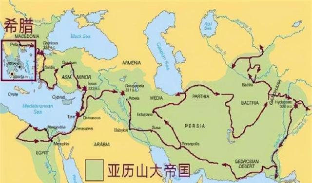 在波斯这个大敌被消灭以后,亚历山大已经打下了一个非常庞大的领土。他所率领的希腊联军从希腊出发,攻下了整个安纳托利亚半岛,又统治了埃及,整个帝国的领土范围从马其顿一直延续到了现在的伊朗。